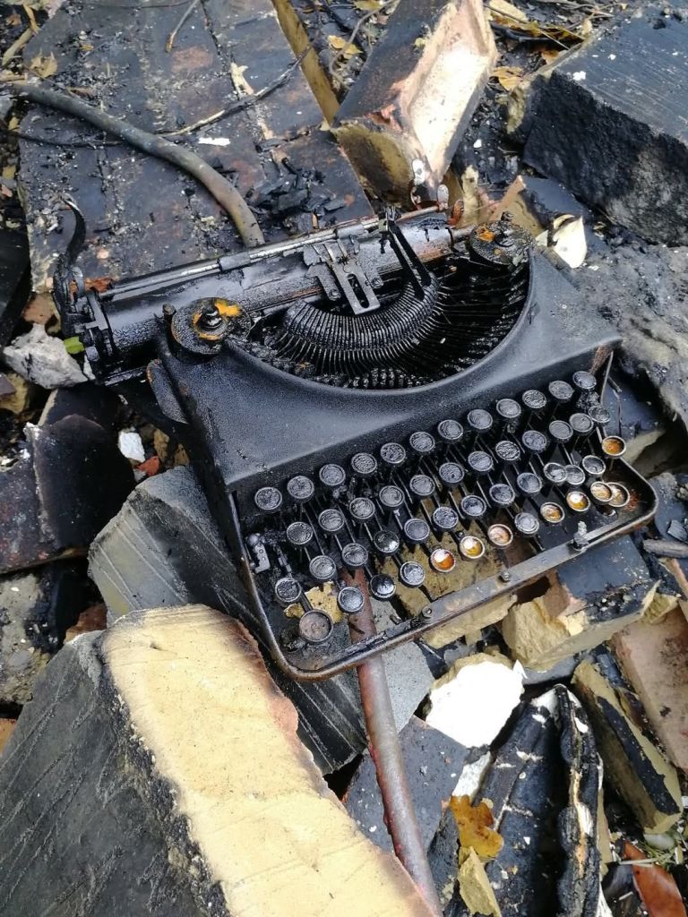 I really felt for the people who’d lived in that house until yesterday. It’s hard to describe the feeling of the loss of pretty much every ‘thing’ – photos, mementos, gifts, books, crafted things, embroideries, drawings, 50s pointed dancing shoes, paintings, the pots and pans my mum cooked with, her ‘best’ china, gardening shoes, boots, plants, tools, screws and hooks – beds, sheets, clothes, the towels, soap, passports, birth certificates, school reports, dad’s papers from 75 years of never really ever stopping working, piano, clocks, graduation photos, records, car keys, the car, door keys, the doors, windows, floors, walls, pipes, roof. All exchanged for soot, rubble, some melted glass and a dead typewriter. We found lots of wet, dirty, photos too, oddly – spent weeks drying them – brought the stench into my house, spread our wet, torn, burnt, filthy remains out on the table…