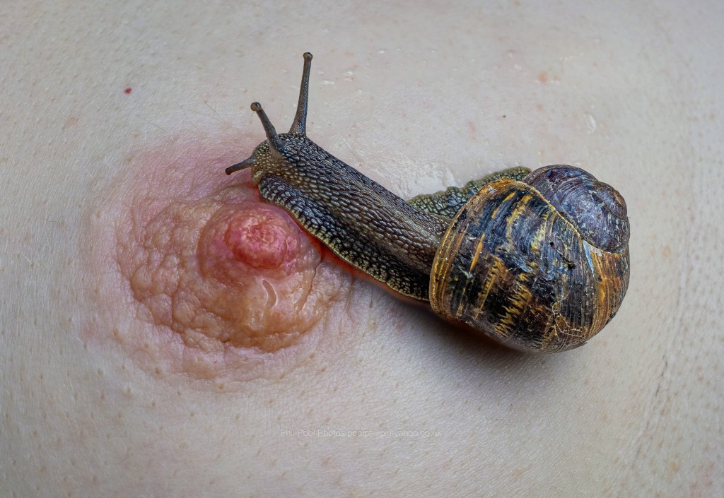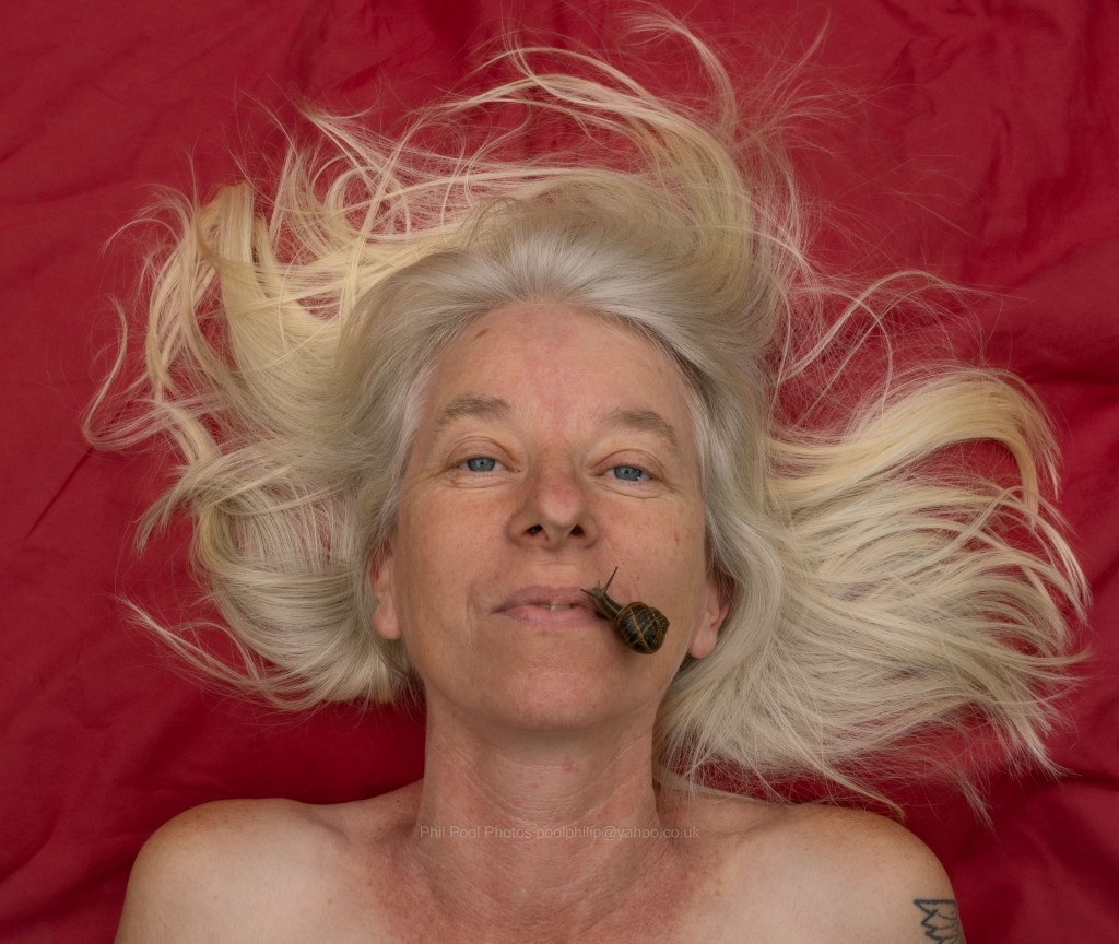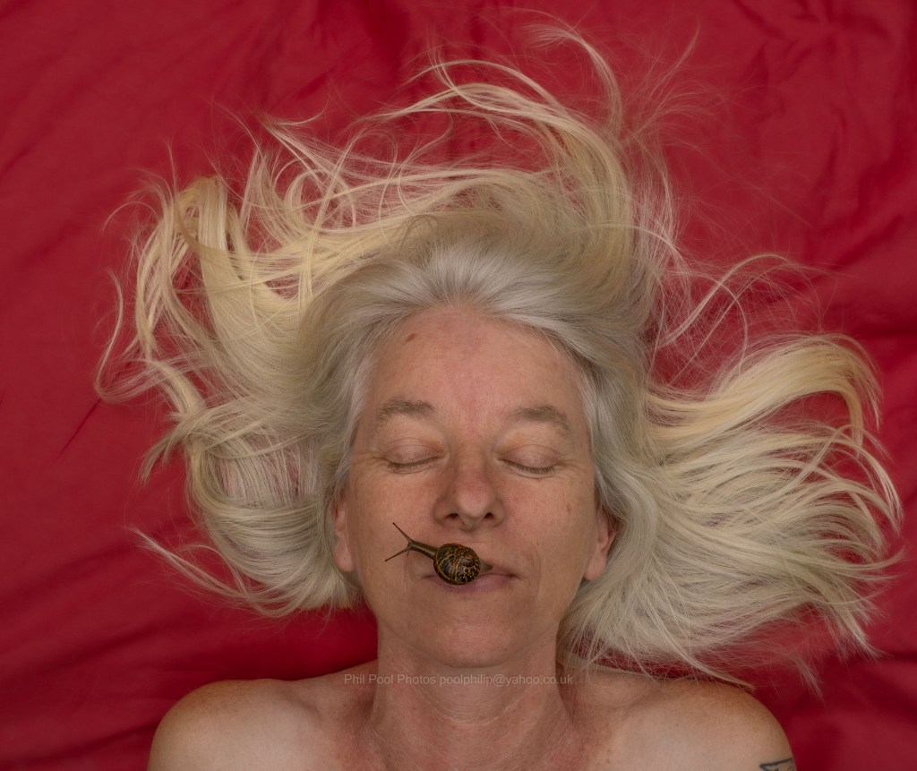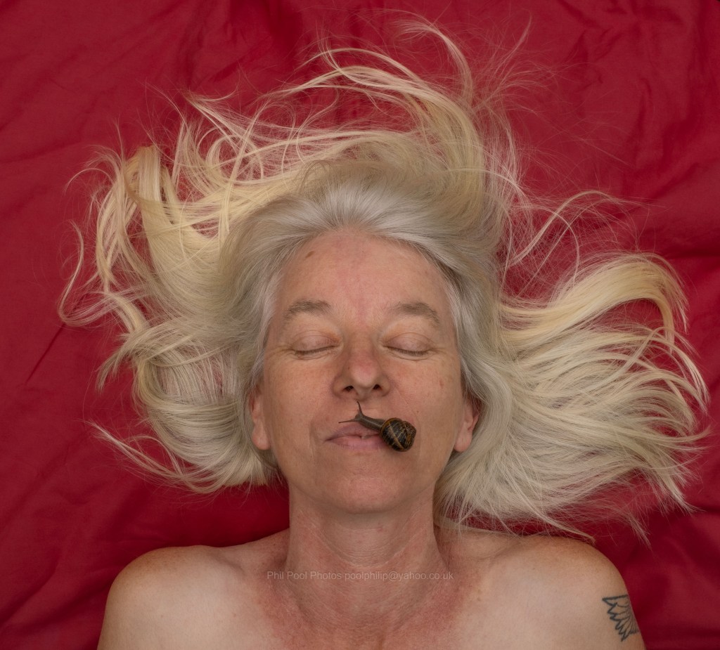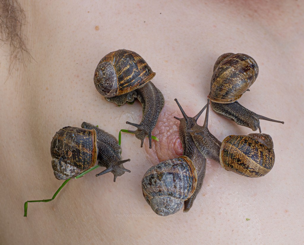 Watching the way their tentacles explore my fleshy curves and crevices and hair is tantalising. This fascination evolved more after, looking for a new idea for photos, I mentioned to Phil I’d once photographed someone with a snail placed intimately upon them some years ago.