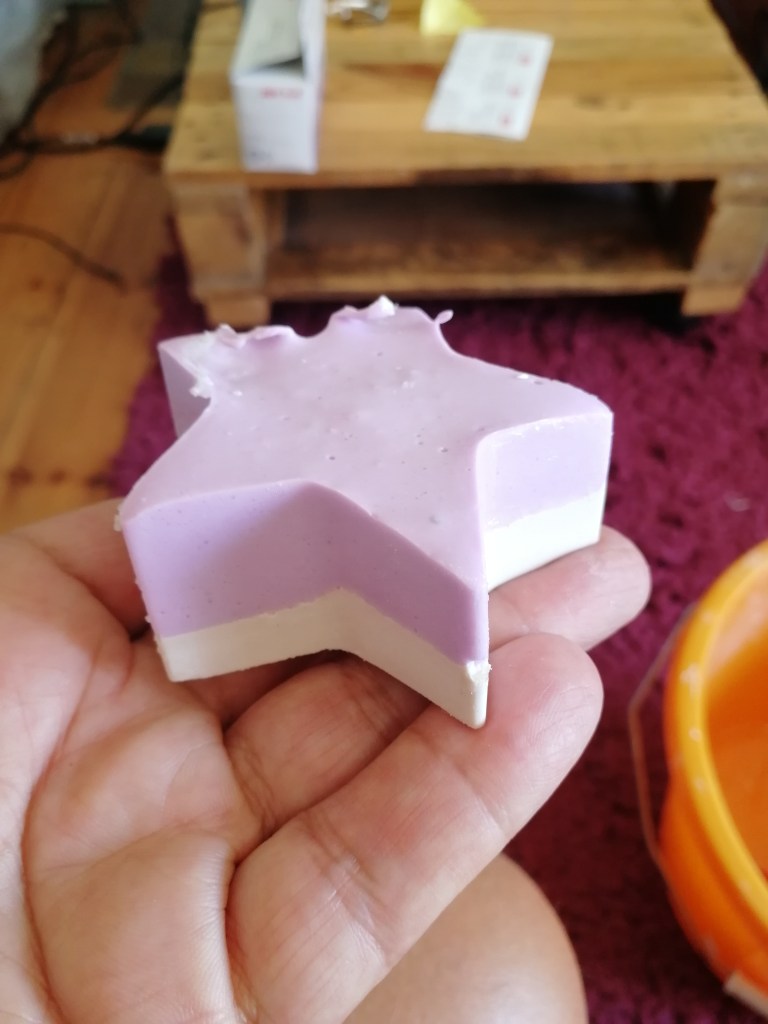 Press the alginate down a little in the molds and add the mixed plaster – to mix the plaster use about 45g of plaster to 28ml of water for two nipples. Lightly brush the surface of the alginate with liquid Vaseline. Pour in carefully and leave to set for 30 to 40 mins – when firm push the alginate and plaster out of the star molds and set aside to dry. A second set can be made – a third one is possible occasionally. The alginate dries out steadily and the moisture is drawn out by the plaster. That causes the molds to shrink and to split – that can be reduced, just a little, by putting the molds containing the setting plaster in an box with some wet tissue.